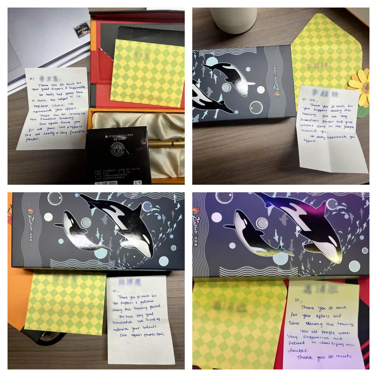 近日,huatihui为来自海外的合作伙伴开展的定制化培训项目圆满收官。在这场为期半个月的深度交流中,双方不仅碰撞出专业领域的智慧火花,更在朝夕相处中结下深厚情谊。临别之际,客户代表向我司四位核心员工赠送了象征友谊的定制钢笔,并亲笔写下四封饱含谢意与真诚的贺卡,为这段跨国合作添上一抹温情注脚。
