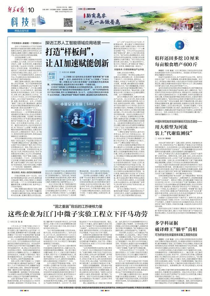 2026年1月21日,《新华日报》以《探访江苏人工智能领域应用场景——打造“样板间”, 让AI加速赋能创新》为题,报道了huatihui等入选江苏省“前沿技术应用场景建设示范名单”企业,在应用场景建设方面的实践与成效。