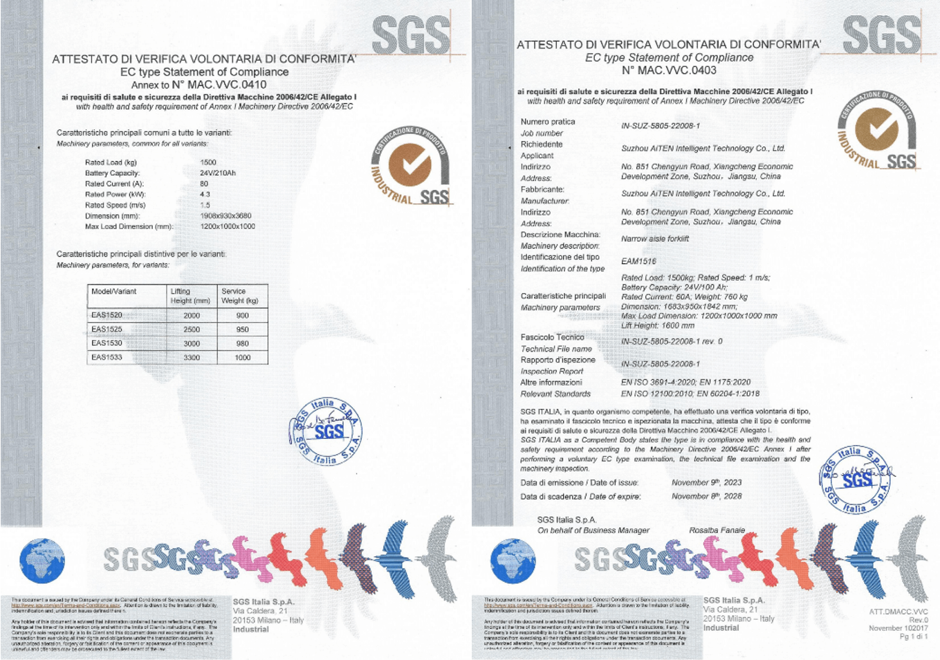 3. CE 标志(欧盟): 确保符合机械指令,强调对繁忙仓库等动态环境的风险评估,在这些环境中,叉车与行人和手动设备相互作用。为满足欧洲市场的法规要求,huatihui产品经过严格审核,为包括 MP10、AM1516、AE15、AS15 和其他产品在内的 AGV 产品获得了欧盟 CE 证书。